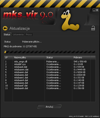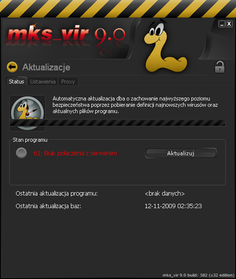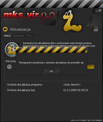 Mks_vir ma też permanentny problem z aktualizacją baz wirusów. Prawidłowe pobranie baz danych z serwera producenta jest praktycznie niemożliwe. Na dodatek po aktualizacji mks_vir domaga się restartu komputera. Po aktualizacji nadal wyświetlany jest monit o (ręczną!) aktualizację programu, która jest jednak niemożliwa.